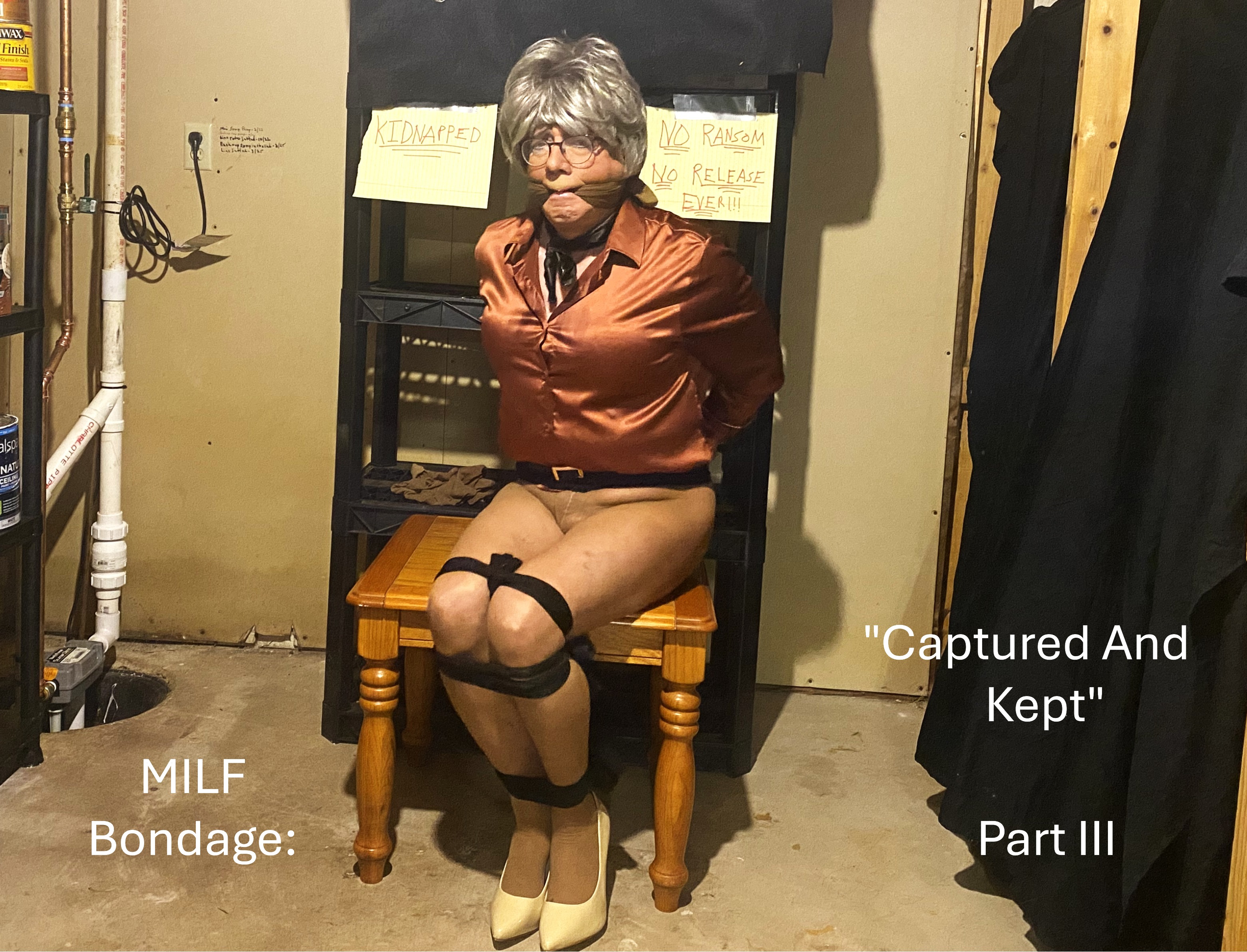 Here is the conclusion to the third installment of my Milf Bondage Series, "Captured And Kept", Part III. The story of a MILF executive who has become the apple in the eye of a very dominant man. So much so, that he captures her with intentions of keeping her forever as his owned property. Part I of this scene was a standing tie, pantyhose exposed, being filmed and photographed. Part II was the combo of a sitting tie and floor tie, all while still pantyhose exposed, in her silk blouse, neck scarf, short skirt, sheer pantyhose, and nude high heeled pumps. Part III is the rest of the sitting tie. Bound and gagged sitting on an end table. There are two variations of the sitting tie in this part. One not attached to the table, but still fully tied and gagged. And the other variation being tied legs spread, to the legs of the table, and nylon stocking hooded.