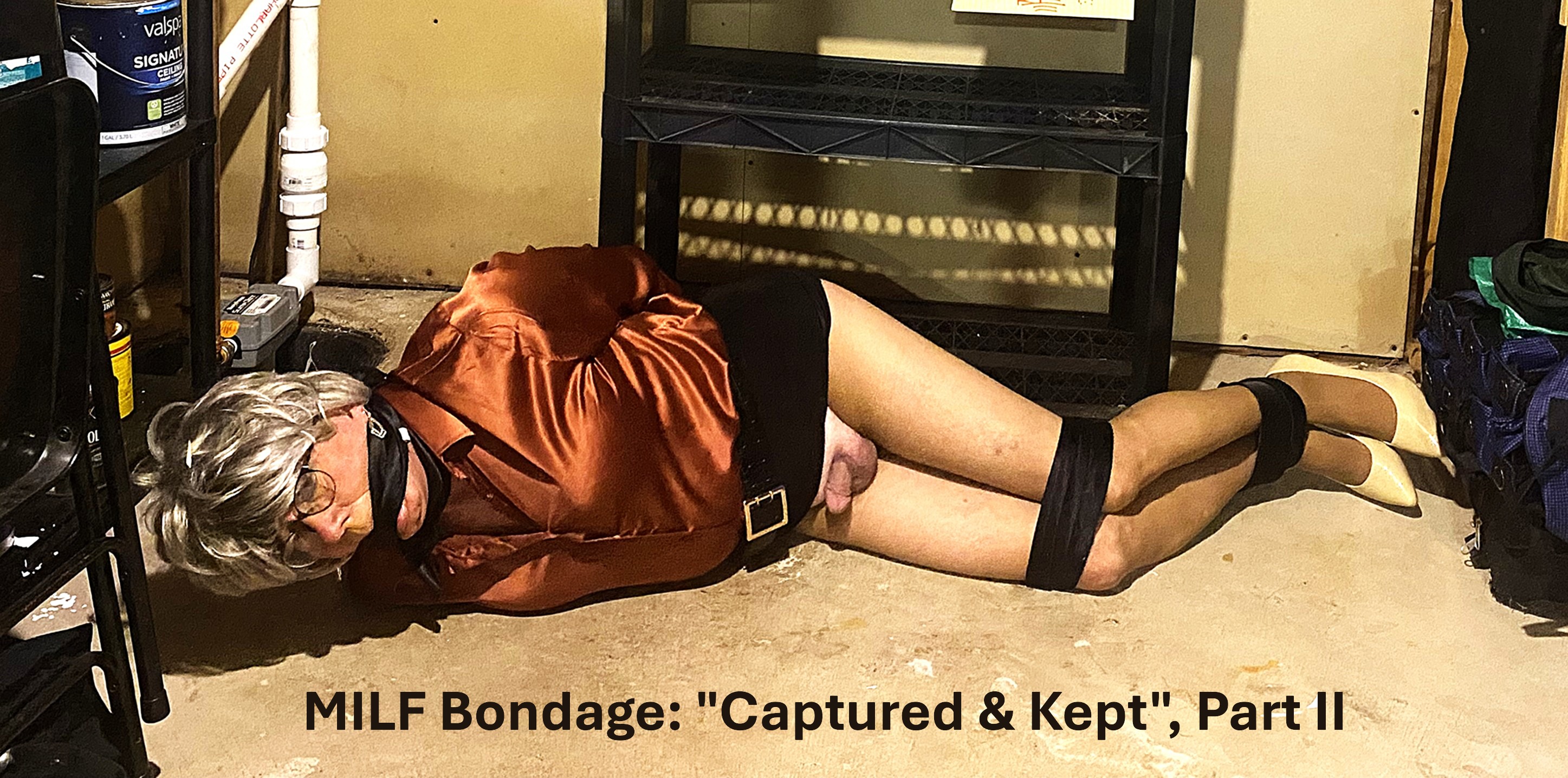 And now the offical conclusion to what has been the most downloaded and streamed bondage storyline on Transformed By Bondage in 2026, the complete video for MILF Bondage: "Captured And Kept". All three parts of this story are included in full, in this 40 min bondage movie of a MILF's capture and captivity at the hands of an infatuated, kinky, perverted, older, dominant male. The perfectly dressed damsel in silk blouse, neck scarf, tight and short mini skirt, sheer high denier pantyhose, and those lucious nude high heeled pumps. Held captive in a basement storage location. Kept gagged with both neckties and pantyhose. And kept tied up with zip ties, neckties, and pantyhose. Standing, posing in bondage. Seated on an end table. And fully bound and gagged on the floor. All while humiliatingly exposed inside and oiutside her pantyhose. With No Ransom! And No Release! Ever!
