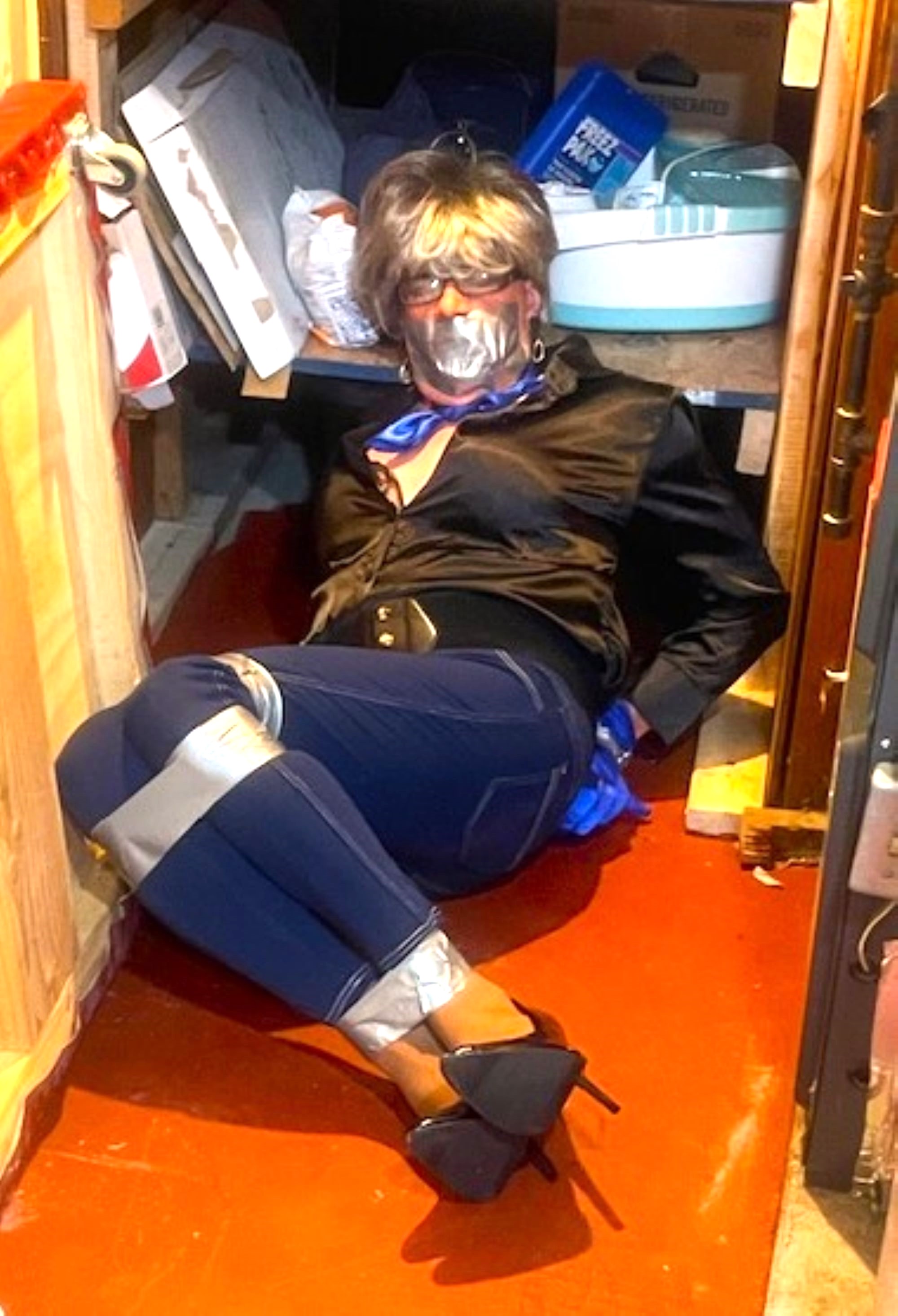 The video for Part I of "The Escape Attempt", my latest scene in my MILF Bondage Series, with me always portraying 60 and 70 something women bound, gagged, and helpless. A Robber has secured our mature damsel in her basement, but she is determined to make an attempt to escape, despite how she is securely bound and gagged. All The Robber could find to bind and gag her was classic silver duct tape. So that is how and why she is bound the way she is. Her mouth tightly sealed with 3 pieces of duct tape. Her wrists wrapped up tight behind her back. Her legs tied in 3 places, at her ankles and above and below her knees. Now inching her way out of the cubbie hole she was tied in, and inching her way to the main back room of the basement. If she can get to there, it is not far to the door that leads to the porch, which leads out of the house. Will she get there? Will she escape? Or is she unable? Or will she be caught by The Robber trying to escape?