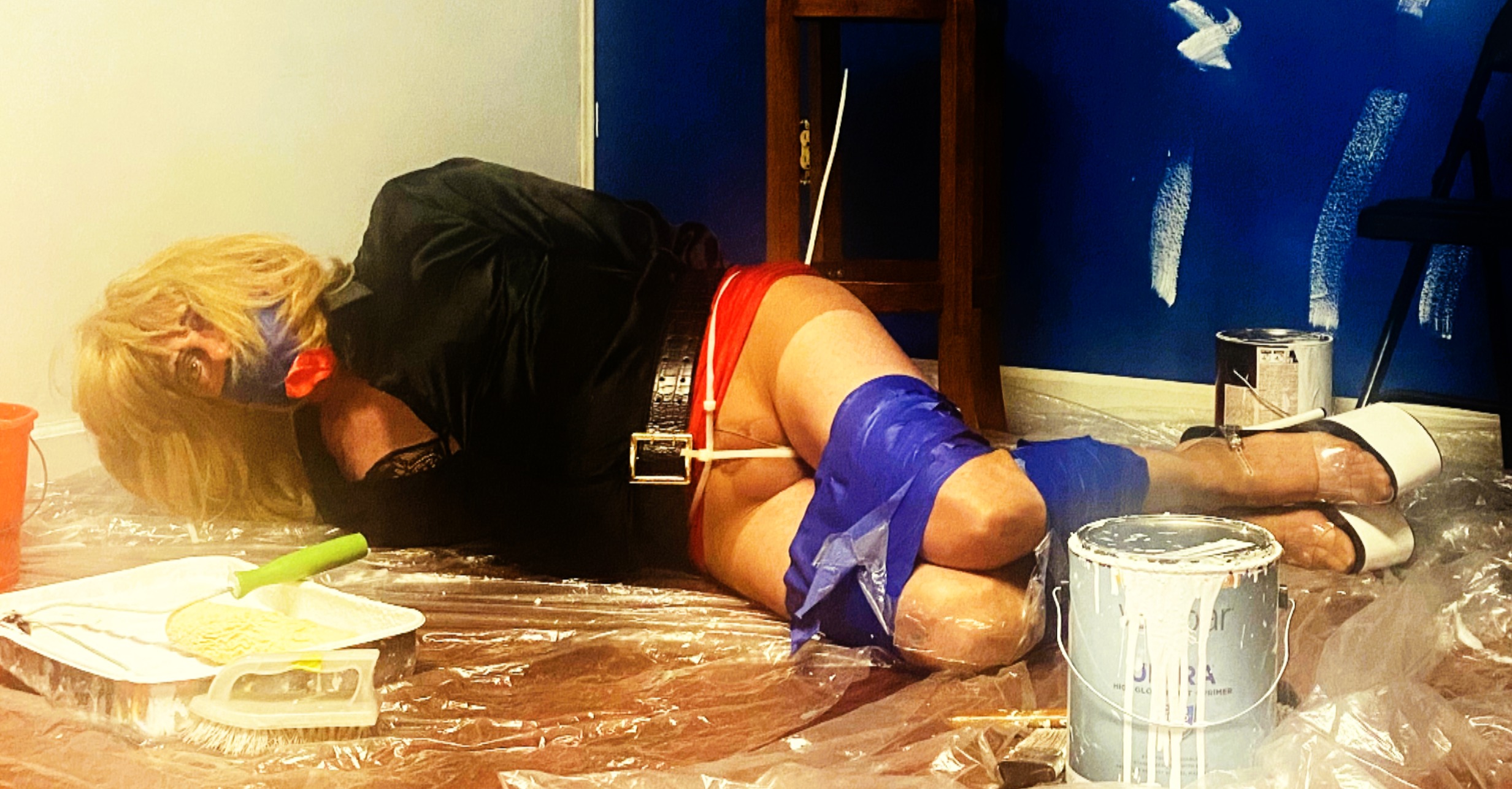 And now, the video for the conclusion to Act I of "The Painter's Prisoner", entitled "Discovery And Capture". Yes, The Painter has discovered that the wife of the man who hired him is a trans, a slut, and a whore. All of which he despises. Here, in Part II, The blond trans wife's humiliation at the hands of The Painter becomes more involved and detailed. Now on the floor atop The Painter's tarp, The Wife's legs remain wrapped in painter's tape and her mouth sealed with the same tape. Her wrists still zip tied behind her back. But she is now exposed in her pantyhose, crotch zip tied, pressing against her clit, putting her clit in bondage. And soon wearing a pair of her pantiesd over her head. And finished with her spandex hooded, unable to see. All while the Painter takes photographs of his helpless captive and films her struggles. All to hold over her head. Before she is moved to another room in Act II of "The Painter's Prisoner", coming in March!